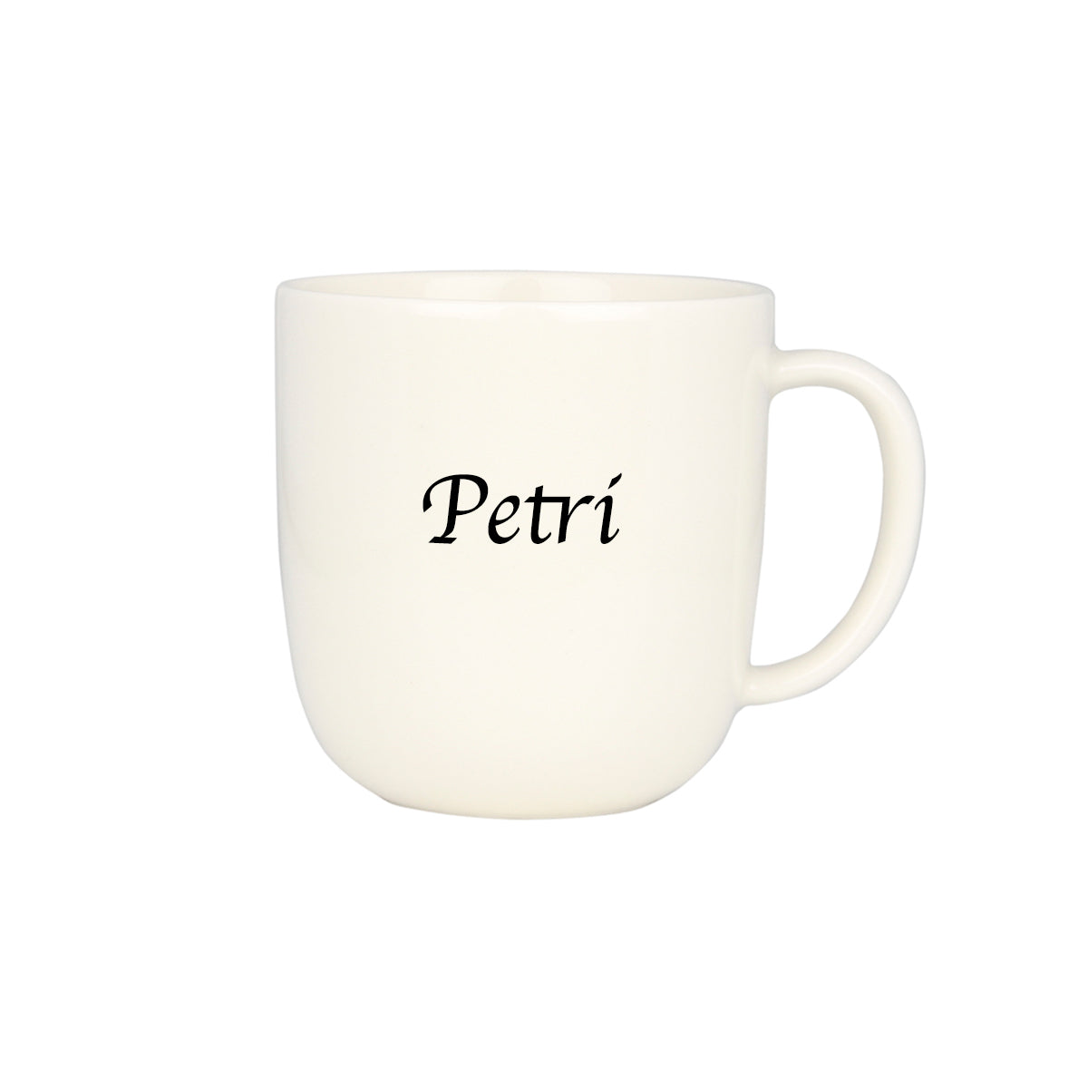 Kultakeramiikan nimimuki, vetoisuus 3 dl. Vitroposliinia, kestää mikron, astianpesukoneen, uunin ja pakastuksen.
