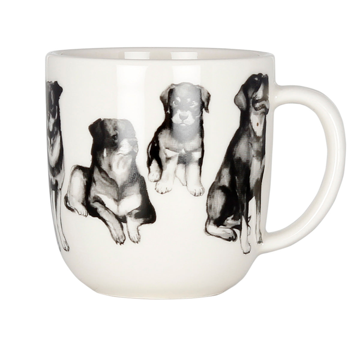 Tyylikkään mustavalkoinen Koiran Ystävät -sarjan muki, Rottweiler. Mukit valmistetaan korkealaatuisesta vitroposliinista. Kuvitus Taru Tonder. Mukin vetoisuus on 3 dl.